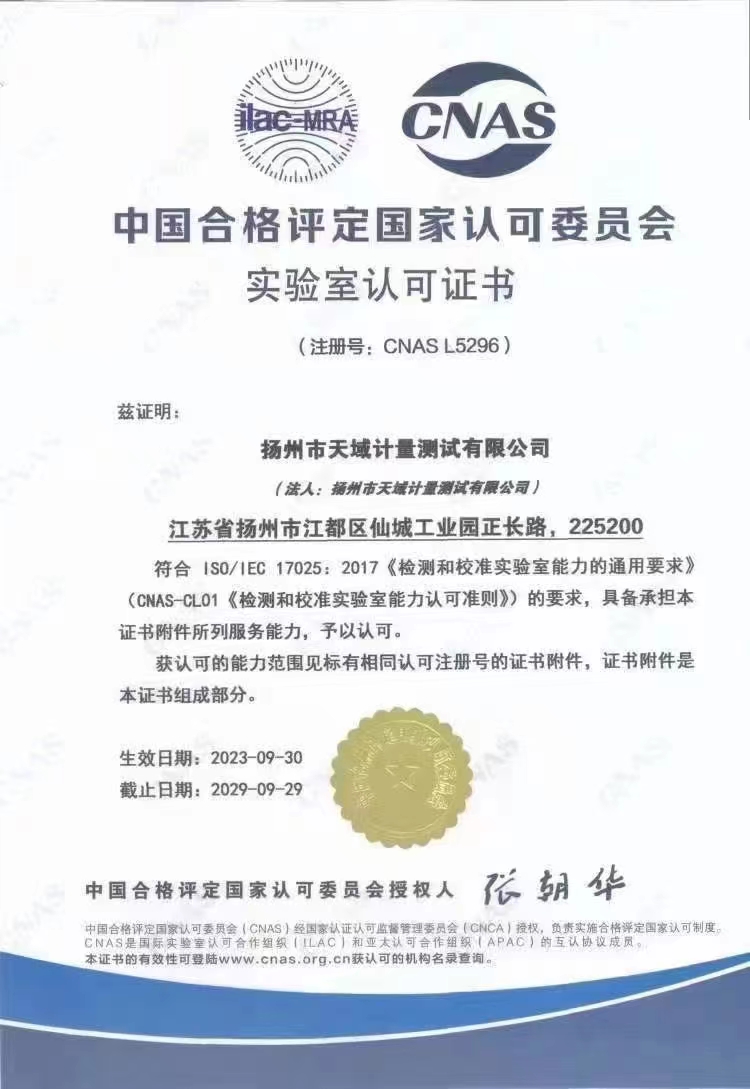 揚州市天域計量測試有限公司,坐落在交通便利的揚州市江都區(qū)仙城工業(yè)園,成立于2010年10月,2011年11月正式獲取中國合格評定國家認可委員會認可(授權),注冊號:CNAS L5296。近幾年的發(fā)展,實驗室已具備了較大規(guī)模,并形成了集計量器具檢測,計量技術咨詢和計量器具銷售為一體的專業(yè)化技術機構,客戶覆蓋蘇南、蘇北、和浙江,安徽部分地區(qū),客戶群總量達到了上千家企事業(yè)單位。實驗室建立健全了一套較為完整的內外部質量管理體系,至今未發(fā)生糾紛和客戶投訴事件。